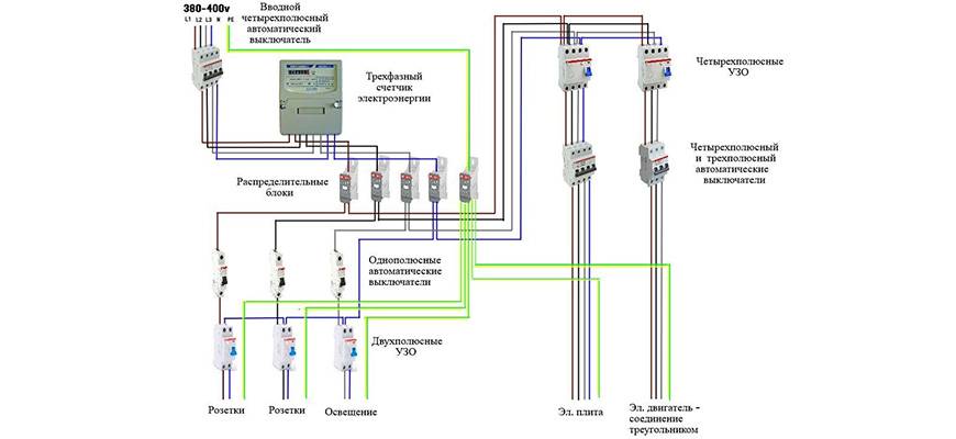 Используется четырехполюсное устройство защиты. С каждой стороны у него 3 фазных контакта и 1 для нейтрали. Необходимость прокладки нулевого провода обусловлена неравномерным распределением нагрузки по линиям A, B и C. Их разводят по дому для подключения 1-фазных электроприемников и только к самым мощным, рассчитанным на напряжение 380 В, подсоединяют сразу все 3.
