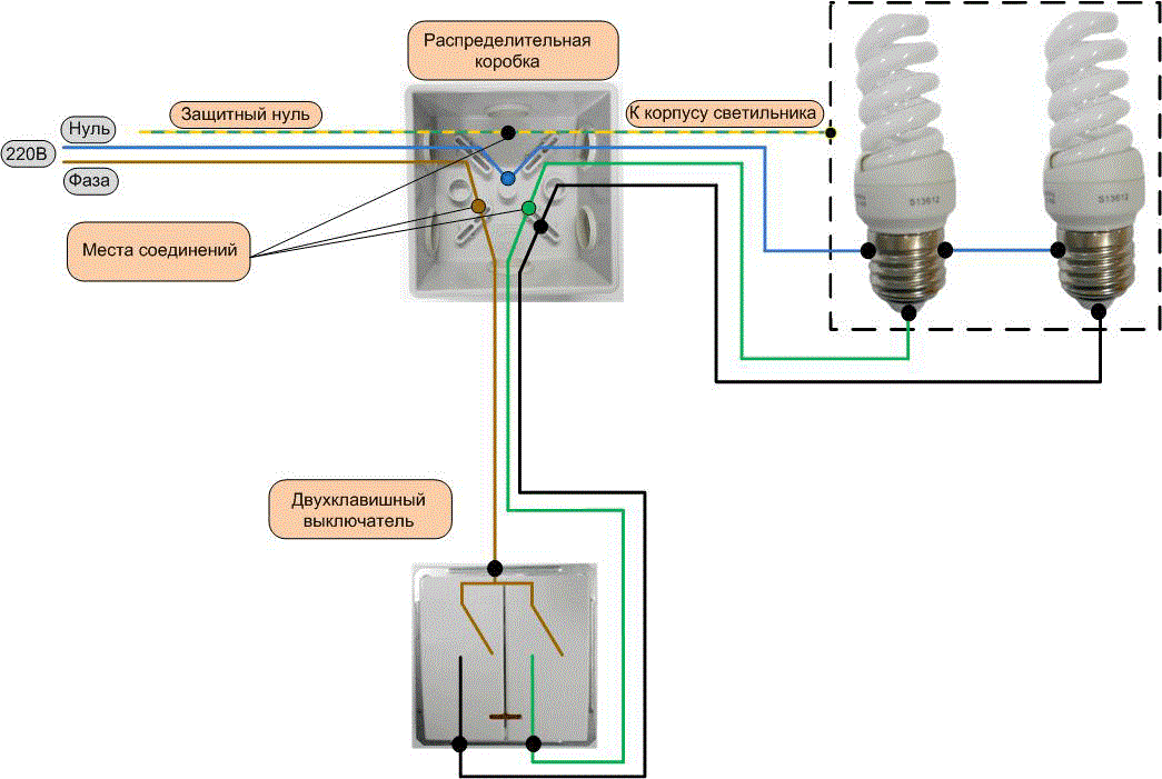 Нулевой провод (N, цвет синий) в двухклавишный выключатель не заводится, он сразу присоединяется к нулевым проводам светильников в распределительной коробке.