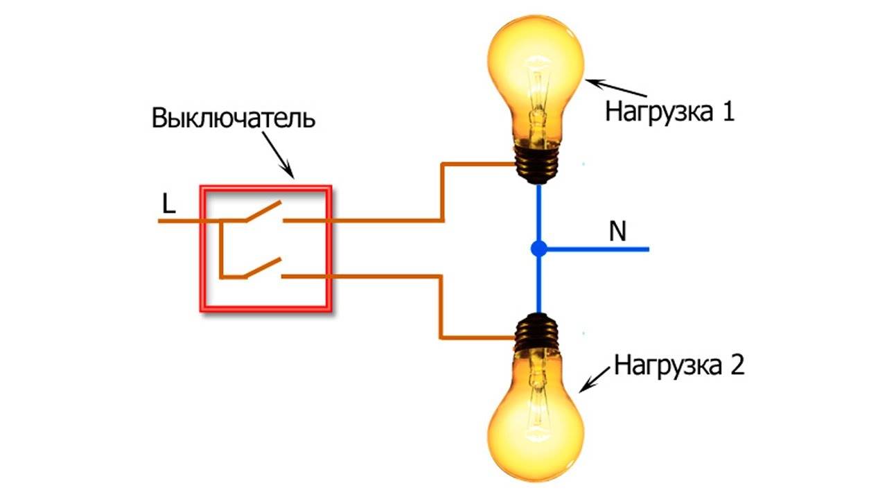 Соответственно, на двухклавишном выключателе имеется три зажима для присоединения проводов — один на входном контакте, и по одному на двух выходных.