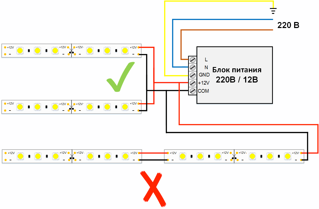 Если длина конструкции превышает 15 метров, понадобится использовать еще один блок питания, если длина более 30 метров — два блока питания и т.д. Подключение сетевого электропровода обычно выполняется к контактам, которые обозначены как N и L. Для многоцветной ленты сначала устанавливают контроллер.