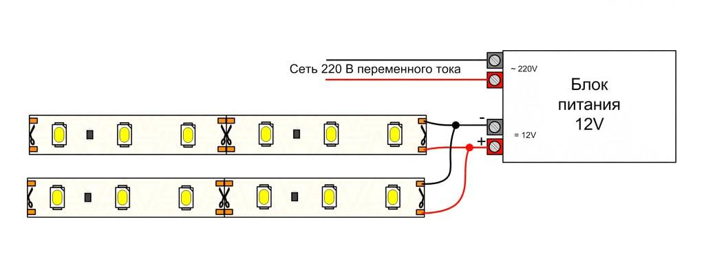Рассмотрим несколько схем подключения к лентам. Выберете подходящую вам. Начнем с того, как выполняется простое соединение, для какого используется лента на 12 В и БП с мощностью 600 Вт.
