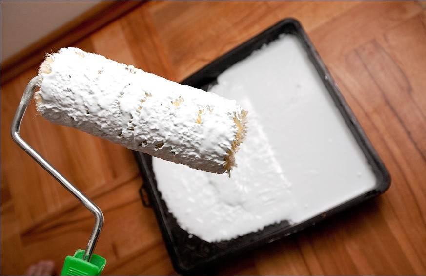 В первую очередь водно-дисперсионный состав наливают в специальный пластмассовый лоток и раскатывают в нем валик, пока он не наберет в себя красящий состав.