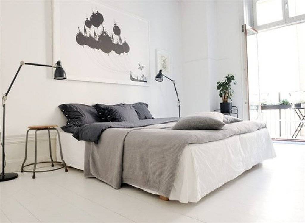 Скандинавский стиль характеризуется навесными открытыми полками над спальным местом, которые декорируют живыми растениями, черно-белыми постерами или фотографиями, добавляющими обстановке атмосферы особого уюта и романтичности.