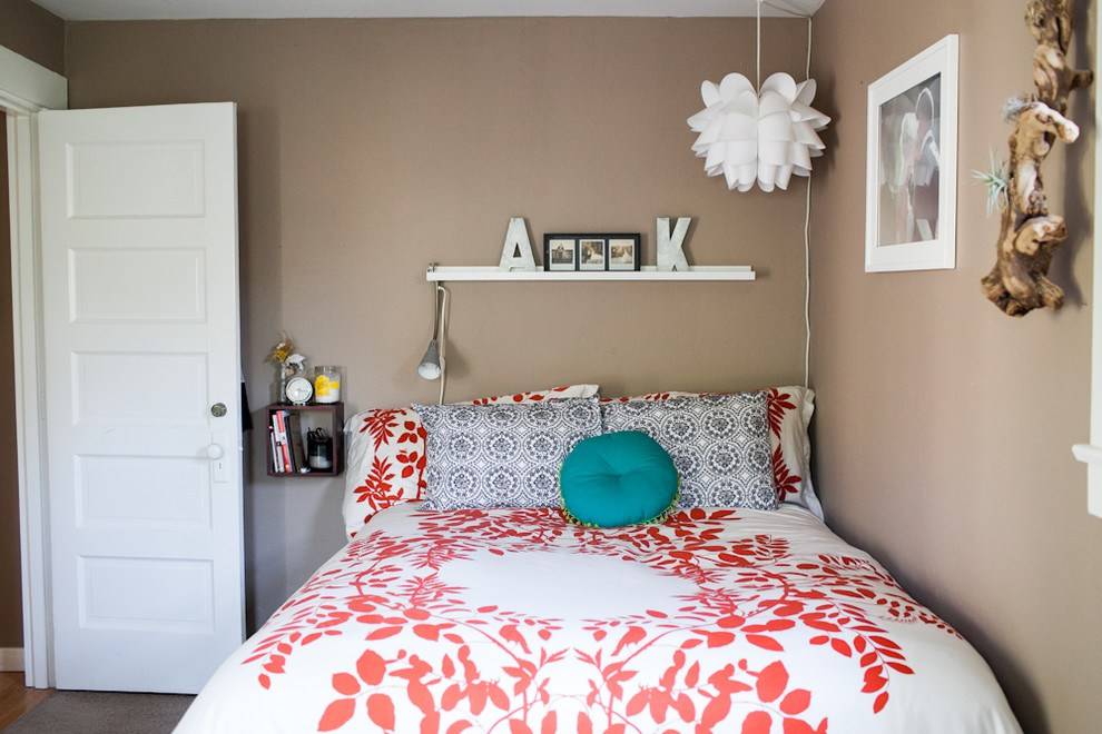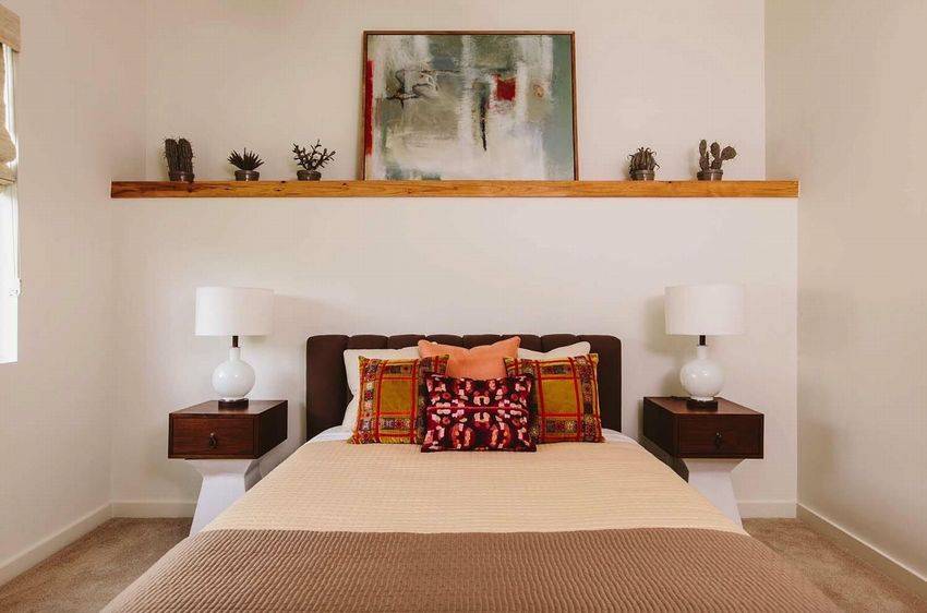 Длинная полка над кроватью позволит визуально расширить помещение