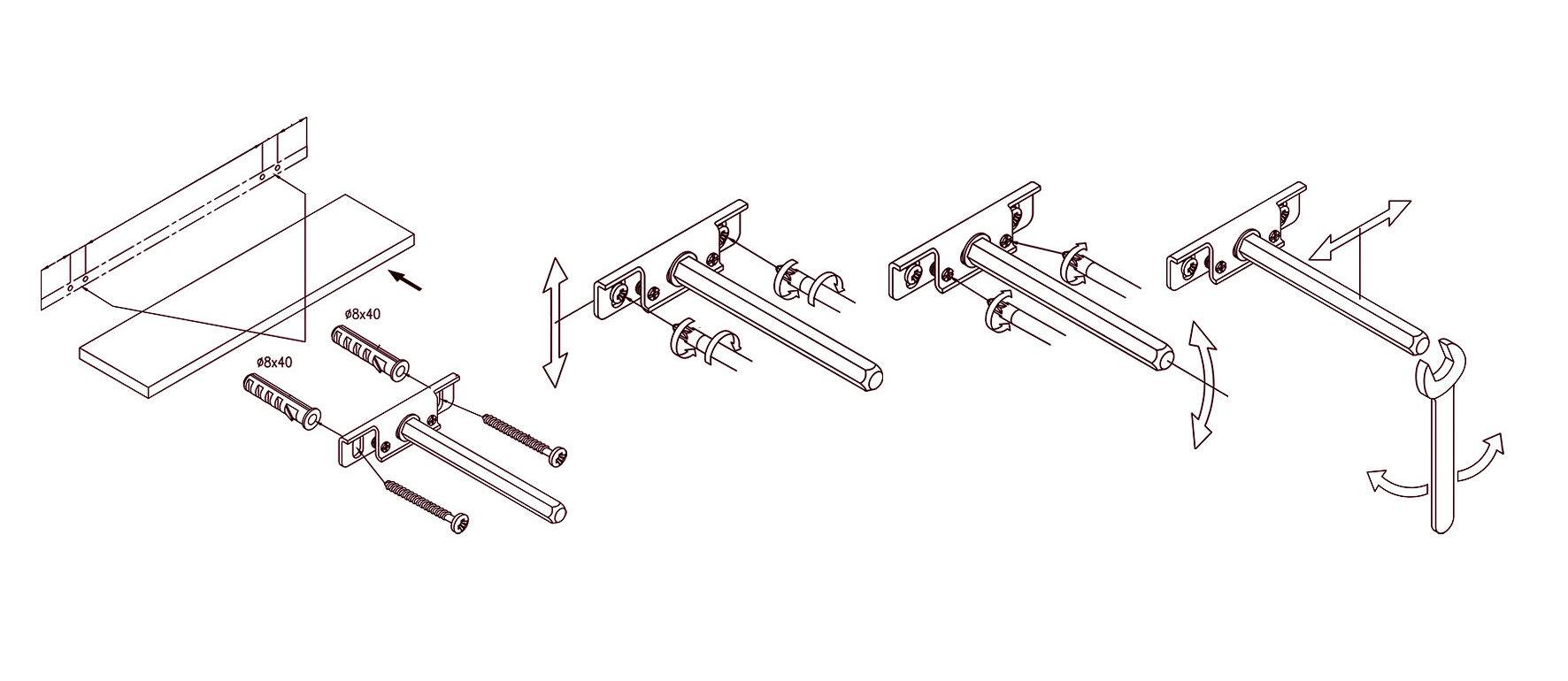 Для того, чтобы изделие было хорошо зафиксировано, размер стержня должен быть чуть короче полки, примерно на 3-5 см. Если полка фиксируется над кроватью, дополнительно используют суперклей, нанося его на торец, прилегающий к стене.