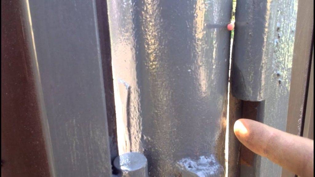 Если опорные столбы сделаны в металлическом варианте, то петли к ним приваривают, а если в деревянном, то прикрепляют с помощью болтов. Шапки болтов должны быть спрятаны внутрь опоры. Для этого делается небольшое углубление, диаметр которого на 1-2 миллиметра больше диаметра шапки болта. После этого отверстия зашпаклёвываются. Таким образом, можно себя обезопасить от воров, так как болты нереально открутить.