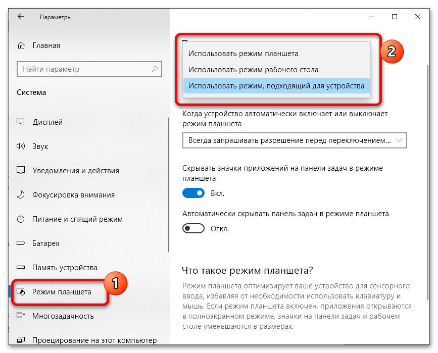 Способ 2: Отключение режима планшета (Windows 10)