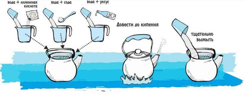 - Для удаления сильных загрязнений на внутренней поверхности посуды необходимо прокипятить в ней воду с добавлением лимонной кислоты или 9-процентного уксуса.