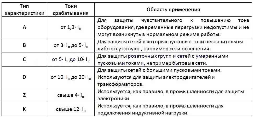 — По характеристике срабатывания — зачастую характеристику срабатывания аппаратов защиты выбирают исходя из назначения защищаемой ими сети (согласно таблице характеристик срабатывания приведенной ниже) однако дифавтомат выбранный таким образом может не обеспечить своевременное отключение цепи при коротком замыкании, характеристику срабатывания необходимо определять по методике приведенной здесь.