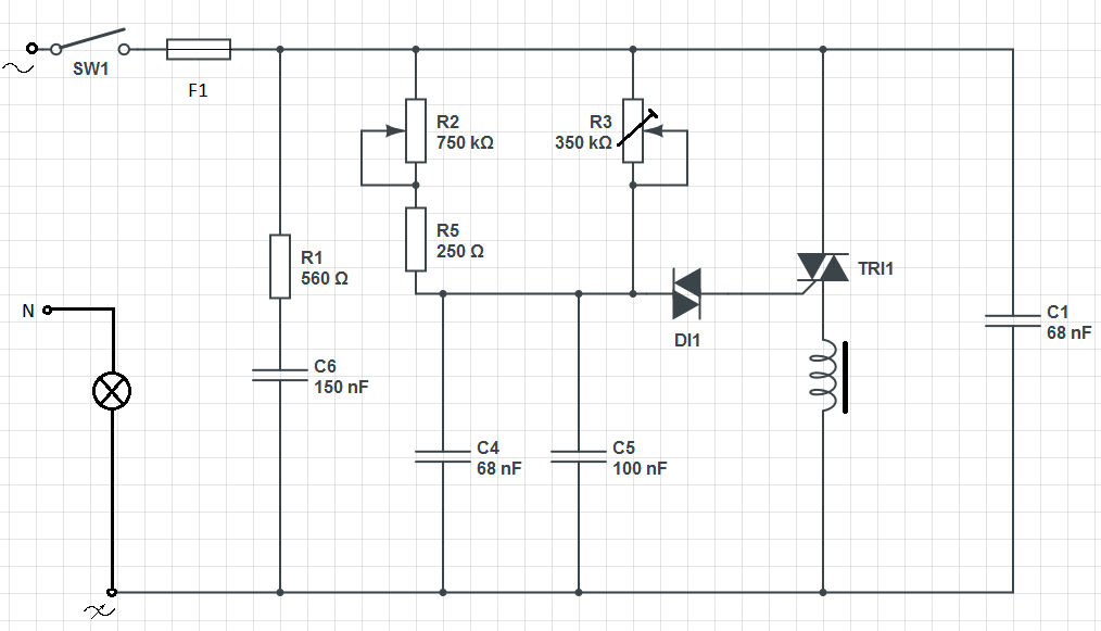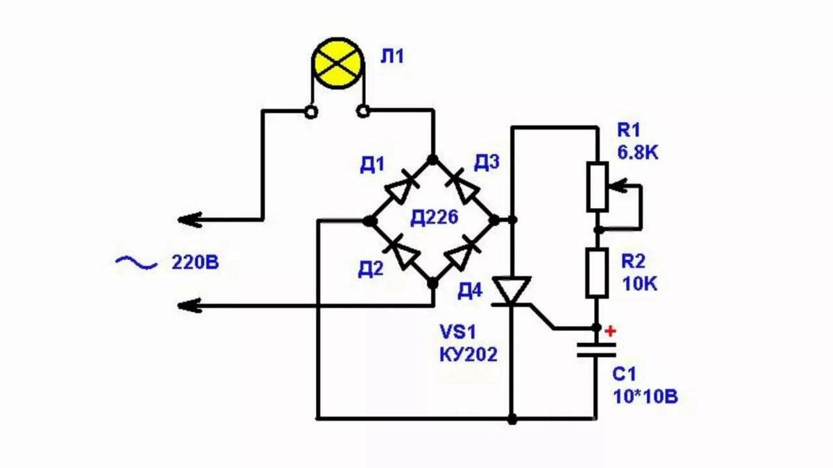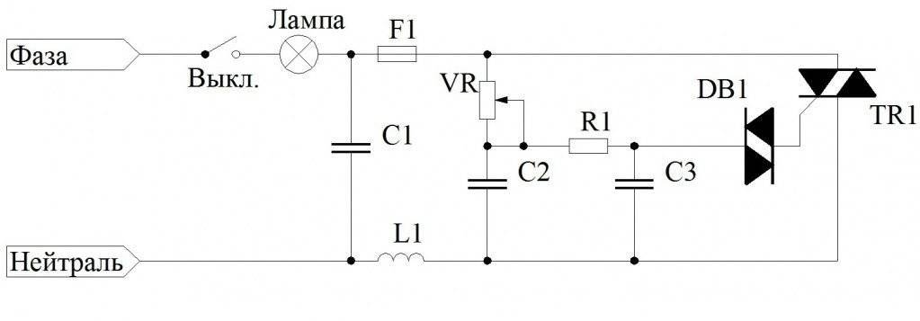 Кроме динистера и симистера, схема простого регулятора света включает резисторы — постоянный и переменный. Вместе с ними также используются несколько диодов и конденсатор.