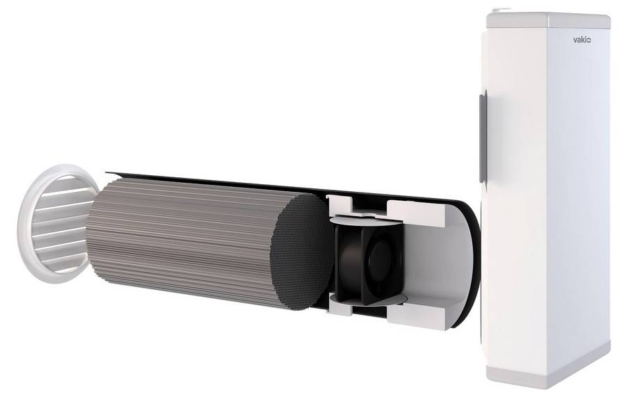 Приточно-вытяжная моноблочная система с теплообменным модулем. Конструкция устройства позволяет одновременно формировать два встречных потока воздуха в одном цилиндре. Имеет две модификации: