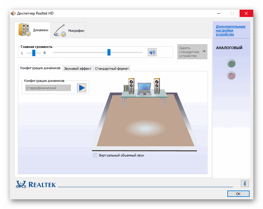 В первую очередь необходимо разобрать панель управления Realtek HD Audio. Это официальное программное обеспечение разработчиков звуковых карт Realtek. Мы решили поговорить об этом программном обеспечении, потому что в большинстве случаев звуковая карта, встроенная в компьютер или ноутбук, создавалась упомянутой компанией. Realtek HD Audio не только устанавливает драйверы и кодеки в операционную систему, но и добавляет программное обеспечение с графическим интерфейсом, позволяющим настраивать звук, в том числе и микрофон.