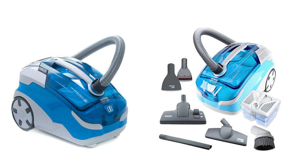 Емкость аквафильтра составляет 1,7 л, бак для сбора воды – 6 л. В комплектации предусмотрено шесть различных насадок, есть HEPA-фильтрация, место для хранения щеток. Регулятор мощности вынесен на корпус.