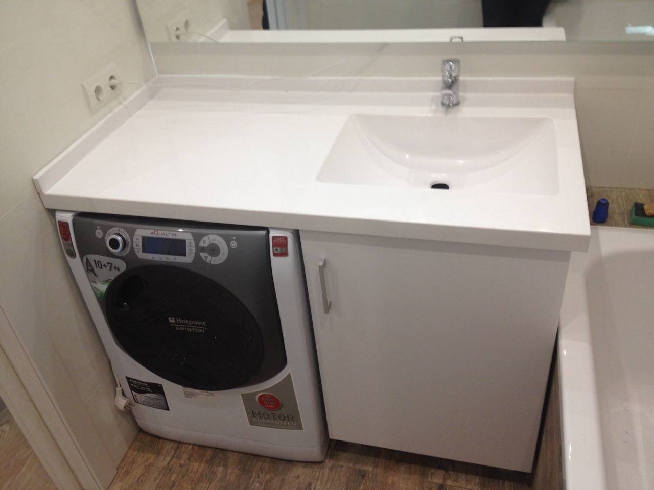 При недостатке места в ванной, покупке новой стиральной машины или ремонте помещения рассмотрите вариант такой установки, это даст больше преимуществ, чем создаст неудобств. Такая установка будет удобна на кухне, когда под посудомоечной раковиной встраивается стиральная машинка.