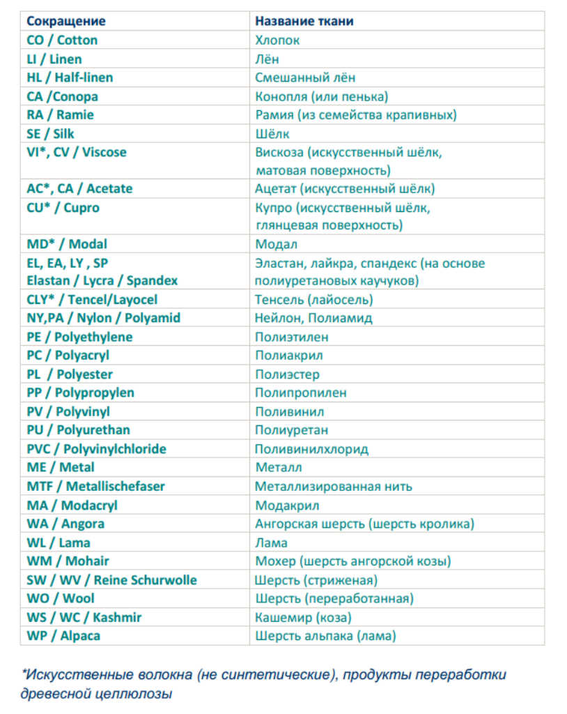 На одежде иностранного производства состав ткани указывается либо сокращенно, двумя буквами, либо полным словом. И для правильного обращения с вещами нужно понимать, что есть что. Обозначения встречаются следующие: