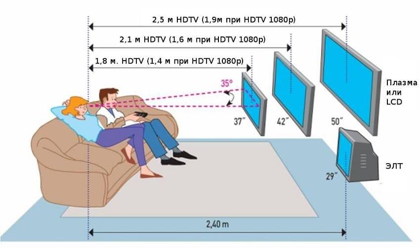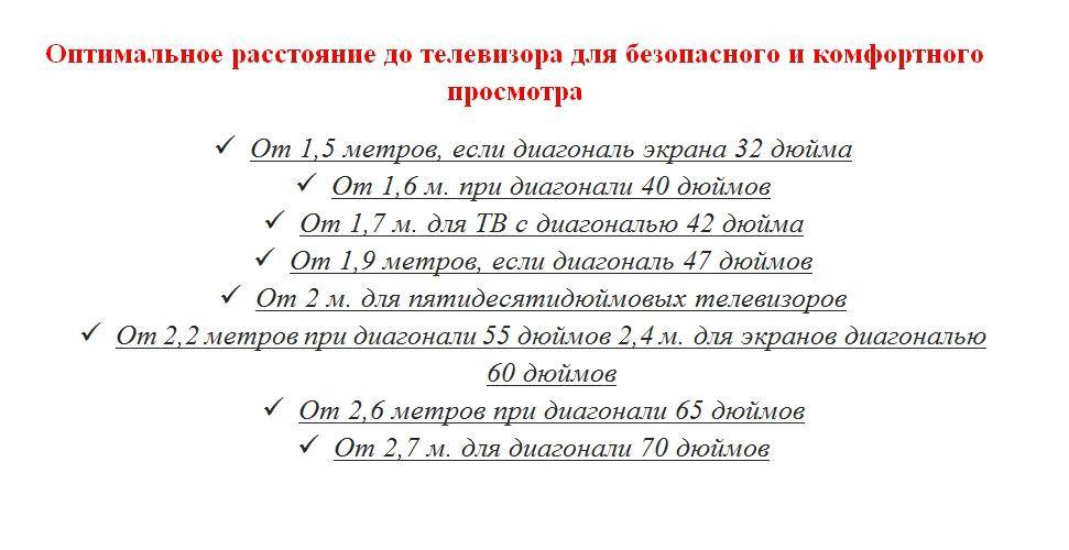 В их отношении также есть ограничения и советы относительно оптимального расстояния от экрана к дивану или кровати. Эксперты рекомендуют умножать диагональ на 5, чтобы получить приблизительный результат.