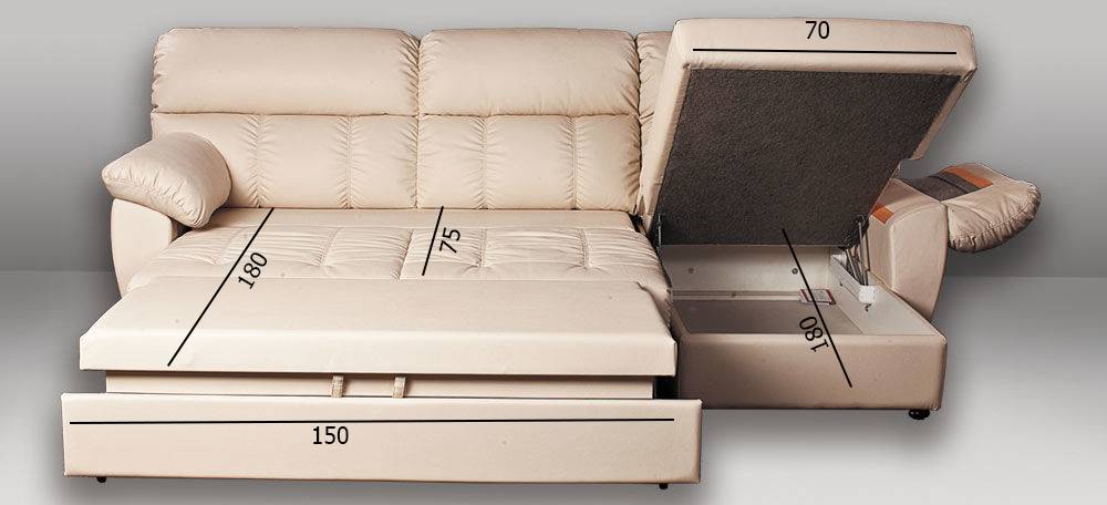| Еврокнижка | Преобразование в кровать; большая поверхность для сна; просторные ниши | Неудобство в положении сидя из-за широких сидений | 90 — 105 | 130-160 | 180-220 | 70-90 | 115-140 |