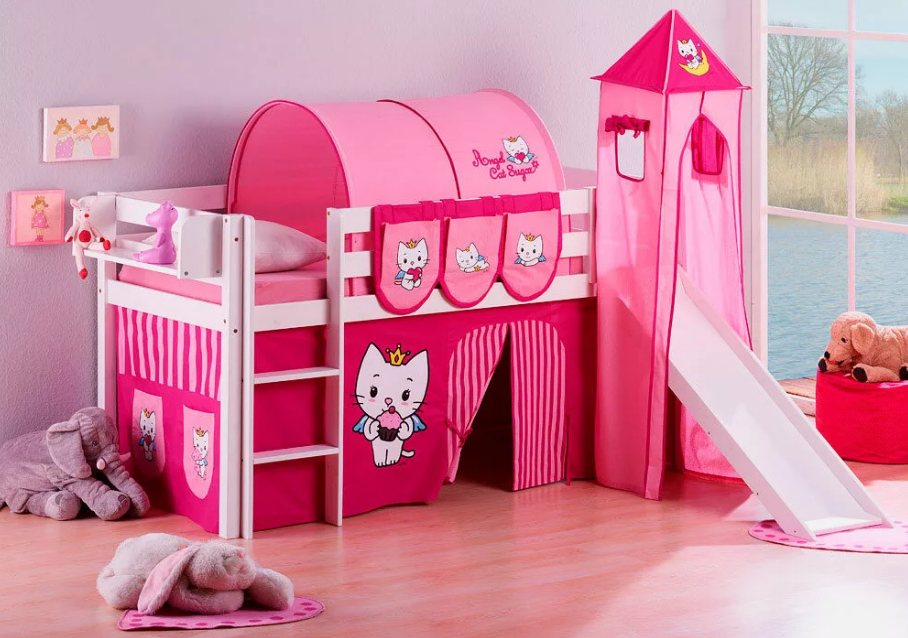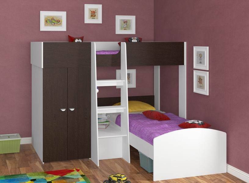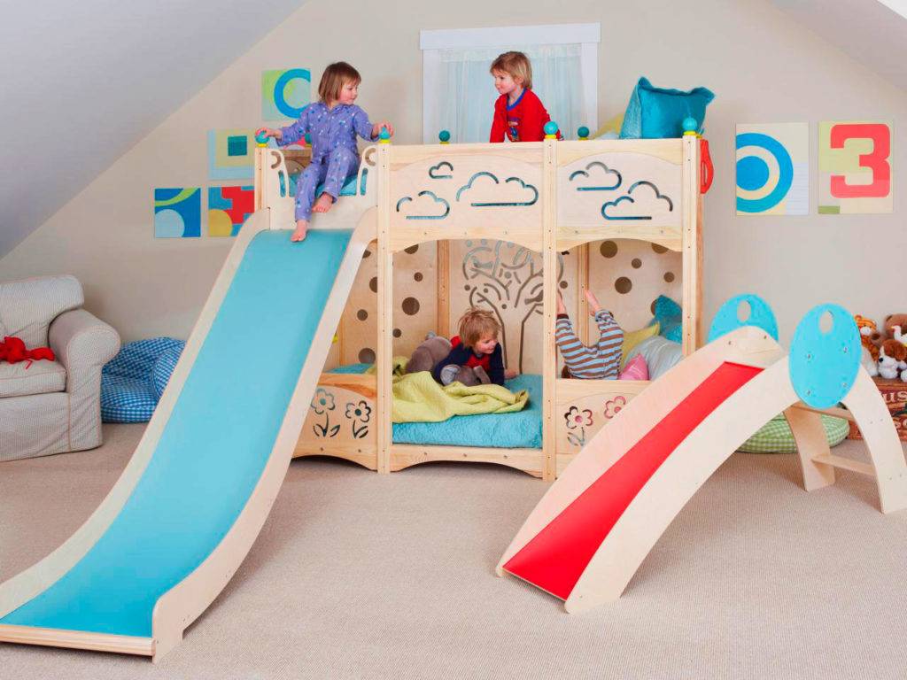 Характерная черта изделий для детей — сказочный дизайн. Конструкции могут быть выполнены в виде машины, космического корабля, дворца и даже животного. Модели с нестандартным дизайном можно найти в отделах мебели либо заказать индивидуально. Еще одно отличие конструкций, предназначенных для детей, — высокие бортики на втором этаже. Кровати, оснащенные таким дополнением, менее травмоопасны. Даже если ребенок заиграется, он не упадет, поскольку высокие бортики защитят от падения. Стоит учитывать, что некоторые производители изготавливают нестандартные конструкции, предназначенных для размещения не 2, а 3 или 4 детей.