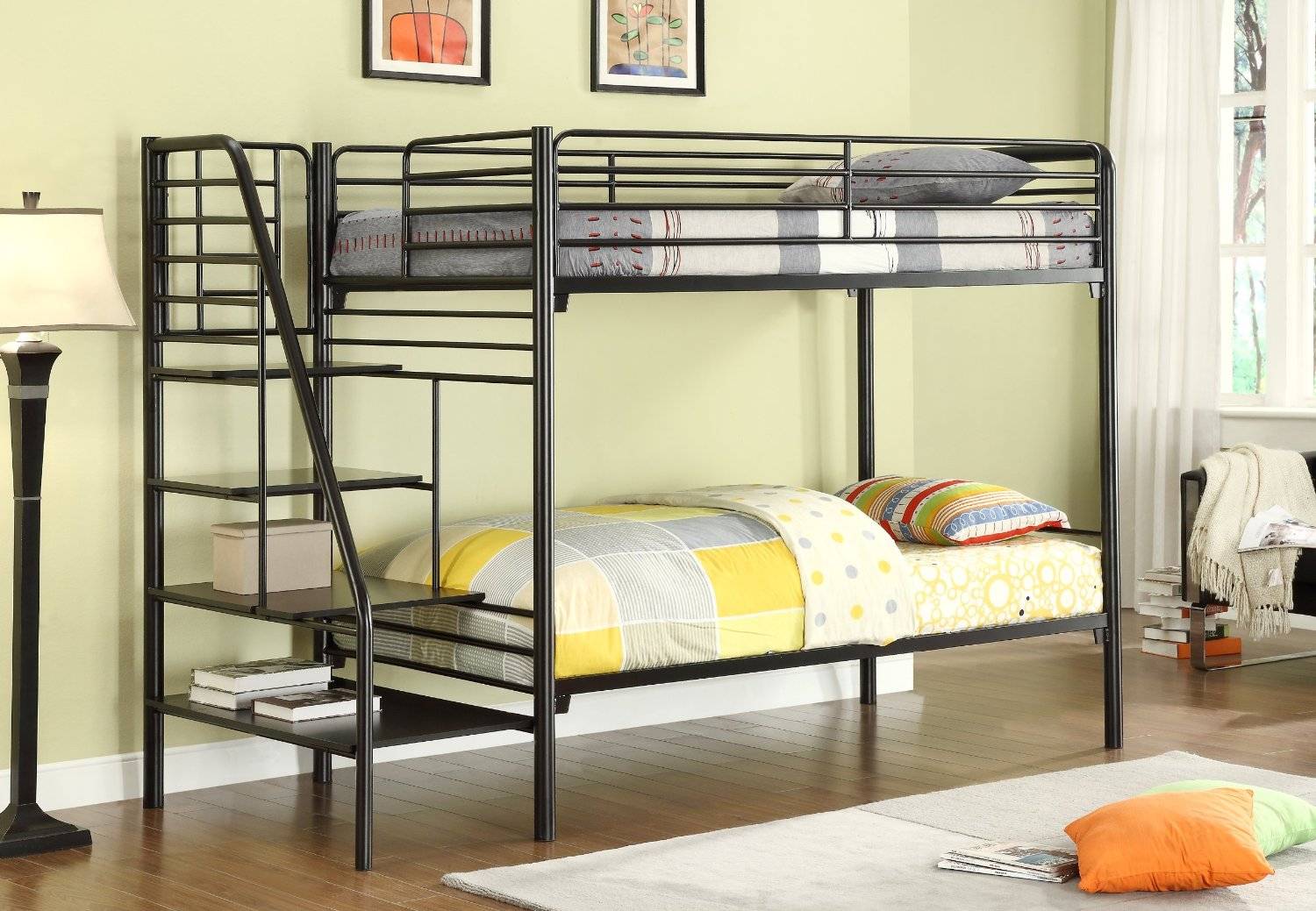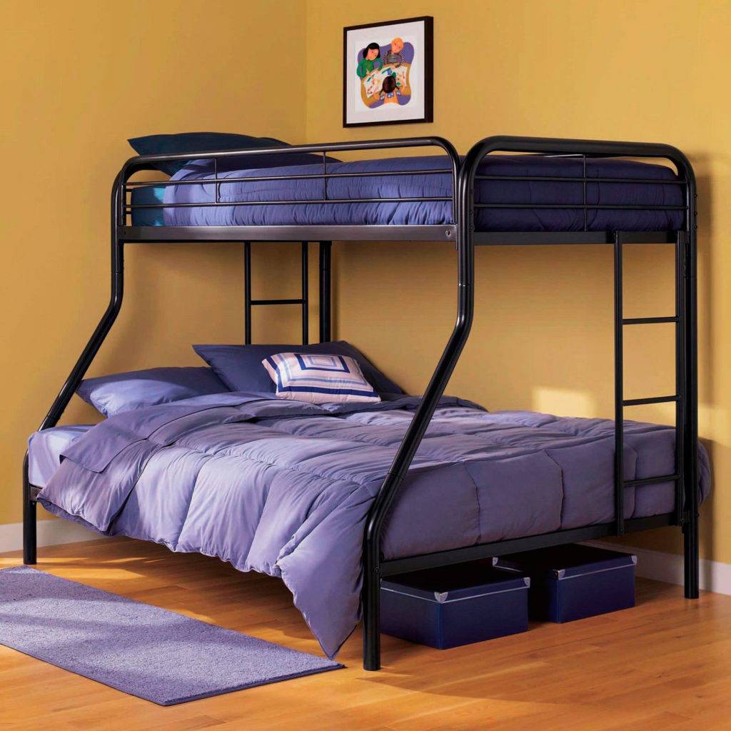 Модели с перпендикулярным расположением спальных мест. Чаще всего внизу располагается просторная двухместная конструкция, а верхняя односпальная кровать расположена вдоль стены, как показано на фото. Такая компоновка делает мебель менее массивной, особенно если она изготовлена из металла.