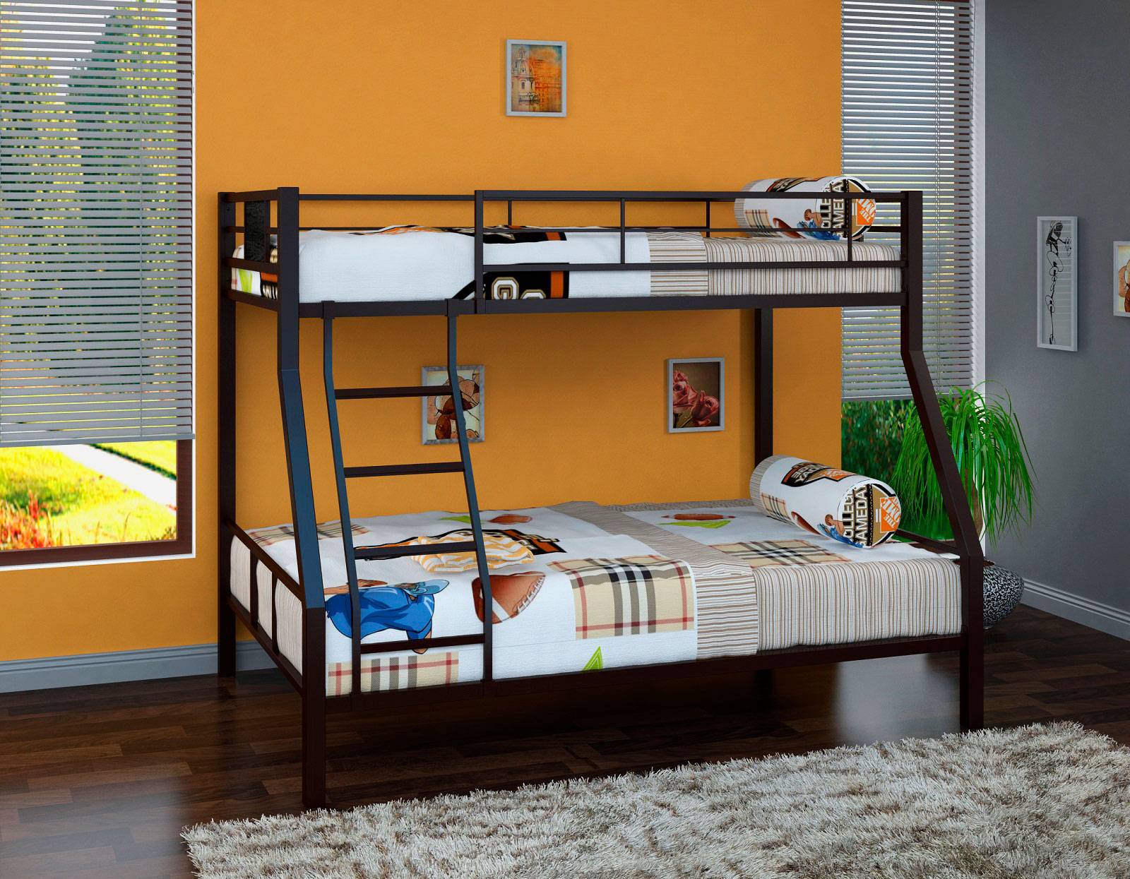 Модели с разными размерами спальных мест. Такие решения чаще всего представляют собой двуспальную кровать внизу и односпальную либо полутораспальную конструкцию сверху.