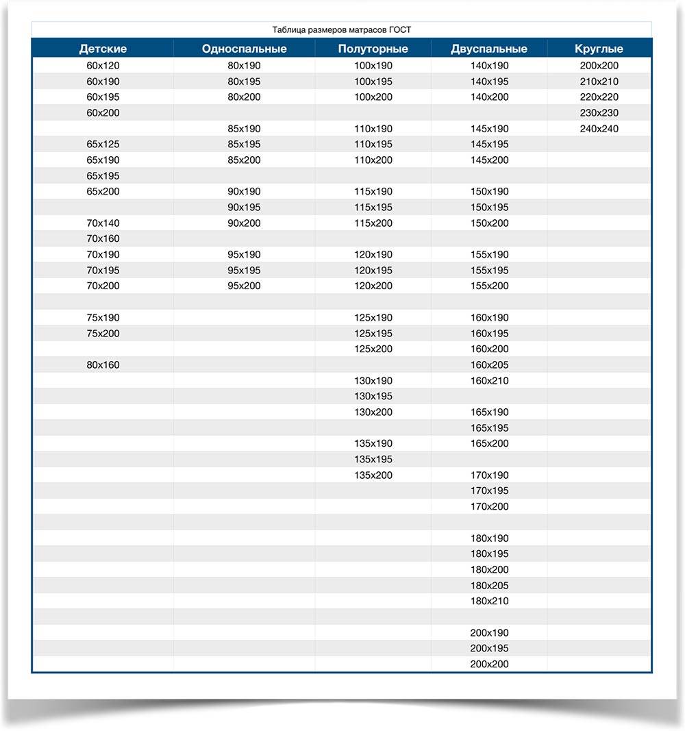По ГОСТ стандарты матрасов имеют такие размеры: