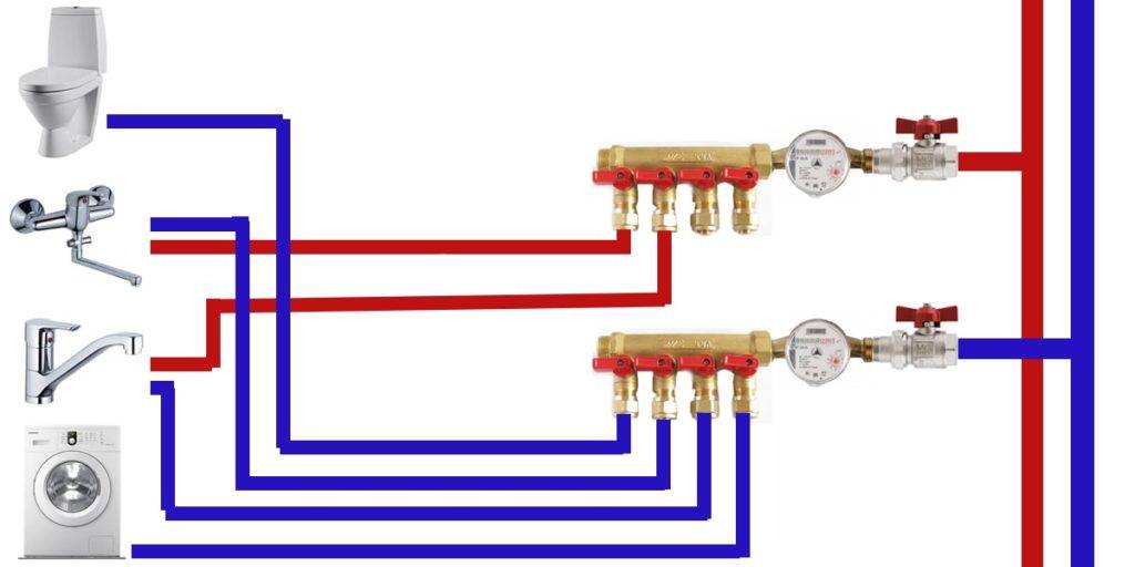 Еще один плюс коллекторной разводки водопровода – это наличие возможности при возникновении поломки отключать только один прибор, а не перекрывать стояк как при последовательном способе. Это же преимущество позволяет устанавливать между точкой водозабора и коллектором разные устройства – редукторы, фильтры и другие.