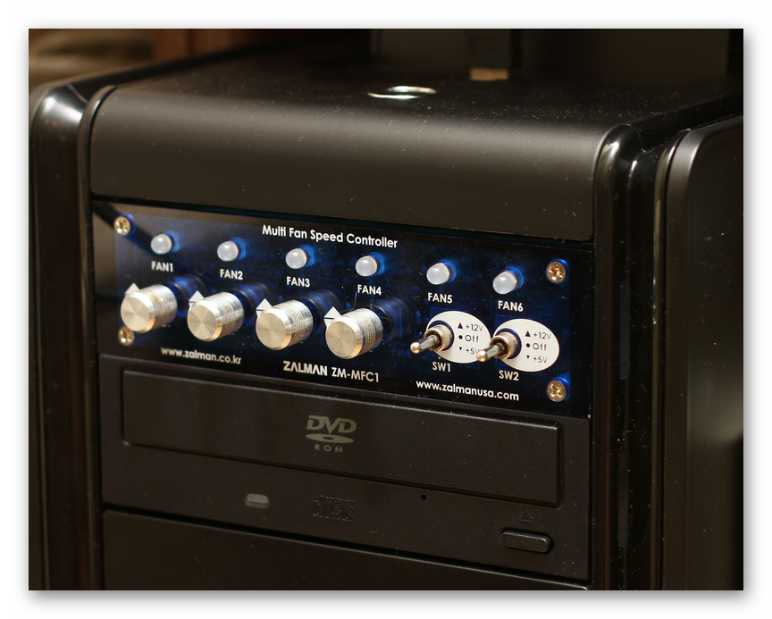 Под дополнительным компонентом мы подразумеваем реобас — специальное устройство, позволяющее вручную настраивать скорость вращения кулеров. В некоторых дорогих корпусах такой элемент уже встроен. Есть и специальные кабели для его подключения к материнской плате и другим вентиляторам. Каждое такое устройство обладает своим планом соединения, поэтому обратитесь в инструкцию к корпусу, чтобы узнать все подробности.