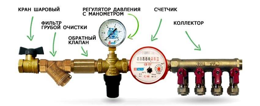 В требованиях, предъявляемых к водоснабжению и канализации, указано, что установку регуляторов давления воды необходимо выполнять на входе сразу после запорной арматуры до приборов учета. При таком расположении редуктор защитит все гидротехническое оборудование, в том числе водяной счетчик и фильтровочные узлы.
