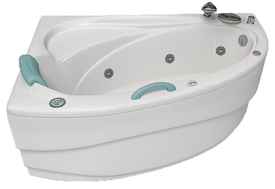 Отечественная ванна с угловым дизайном славится интересной формой, малыми габаритами и достаточной вместительностью. Она позволяет экономить пространство в комнате, поэтому идеально подходит для установки в малогабаритных квартирах. Для удобства тут предусмотрены подголовник и спинка. А дополнительно расслабиться помогают системы аэро- и гидромассажа.