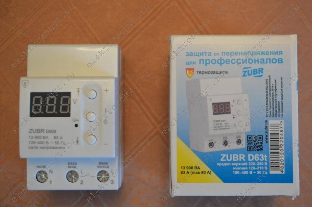 Реле напряжения Zubr выпускают на различные номинальные токи: 25, 32, 40, 50 и 63А. Устройство при номинальном токе на 63А выдерживает в течение 10 минут ток 80А.