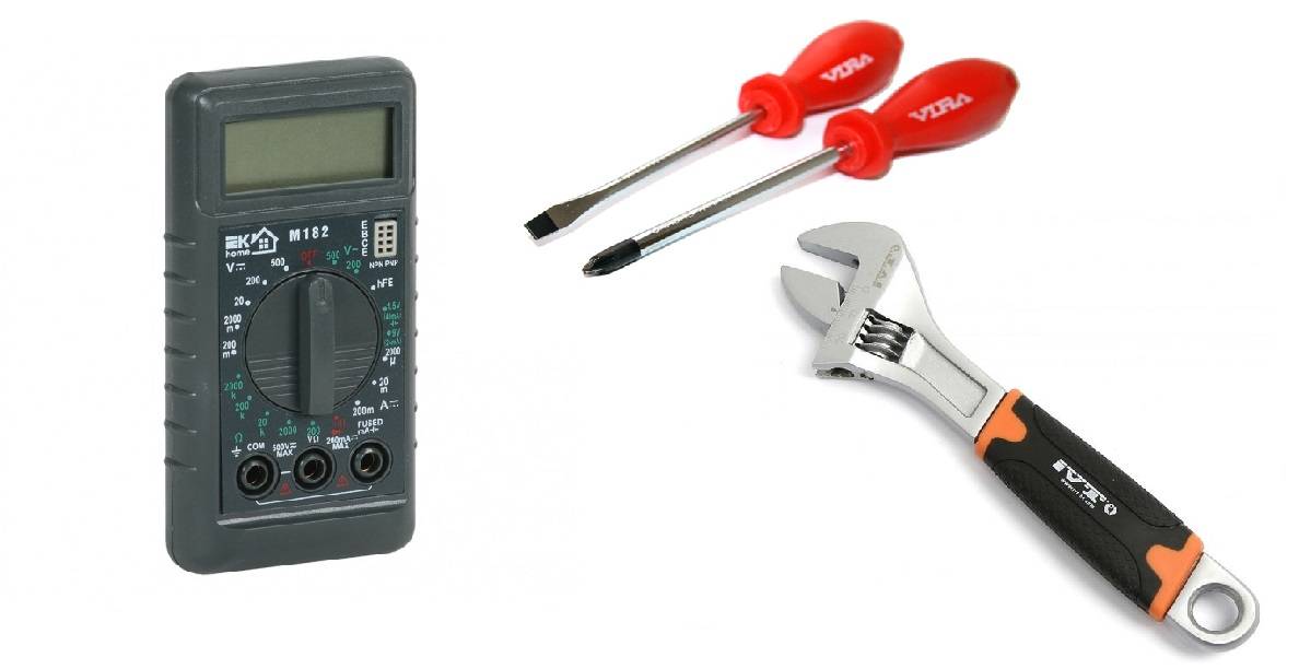 Необходимо подготовить разводной ключ, отвертки и мультиметр. Сперва выявляют целостность электроцепи, далее исследуют силовые элементы: