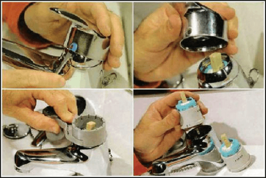 - В последнюю очередь нужно вынуть картридж или шаровой механизм, заменить его на новый, а затем осуществить сборку в обратном порядке.