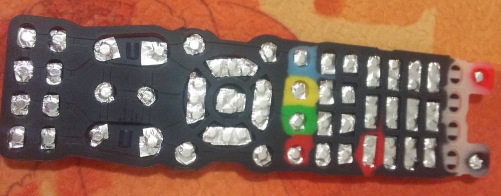 Проводится разборка прибора и извлекается резиновая часть. На оборотной части кнопок фольга, бумагой к кнопкам. В магазинах продаются комплекты, предназначенные для такого вида поломки. В комплект входит: клей и кнопки с напылением. Для ремонта достаточно будет наклеить поверх старых, новые кнопки.
