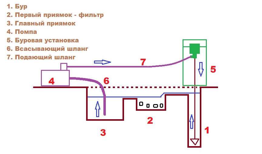 Особенность – нужно учесть, что поступающая из ствола жидкость должна куда-то деваться. При раскачке скважины (но это будет потом, по окончании бурения и монтажа обсадных труб) она попросту отводится. В данном же случае вода поступает туда же – в емкость («приямок»), то есть циркулирует по кругу. Поэтому первый после МБУ резервуар выполняет функцию фильтра, то есть производит очистку технологической жидкости от крупных фракций. В процессе бурения он периодически очищается.