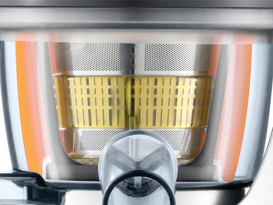 - менее окисленный сок в сравнении с центрифугами, что достигается за счет более медленной и бережной обработки овощей и фруктов и низкой скорости отжима, не превышающей 110 оборотов в минуту;