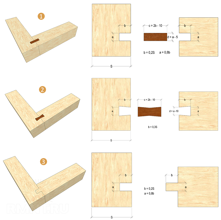 1 — соединение на прямоугольных шпонках; 2 — соединение на шпонках «ласточкин хвост»; 3 — соединение в коренной шип