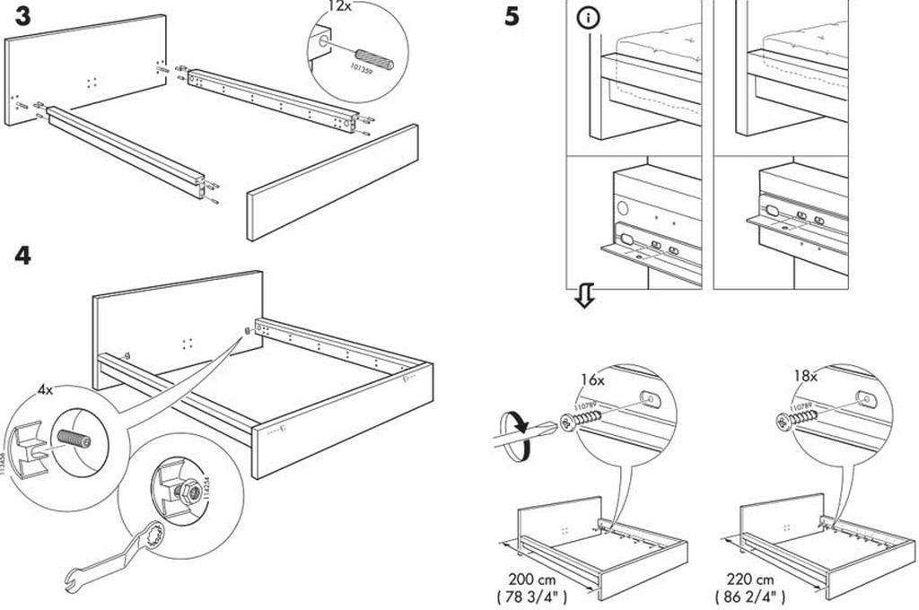 Начинайте сборку с каркаса, затем изголовье и дополнительные ящики. Все выдвижные ящики монтируются специальными металлическими петлями. Для увеличения прочности конструкции можно добавить укрепления дополнительными болтами.