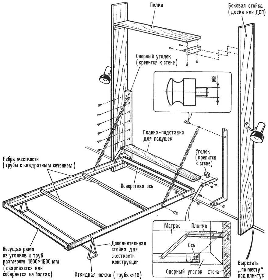 Изготовление конструкции подъемной кровати начинается с детальной проработки чертежей и схем крепления элементов. На эскизах необходимо отобразить размеры составляющих изделия, способы крепежа торцевых, боковых частей и т. д.