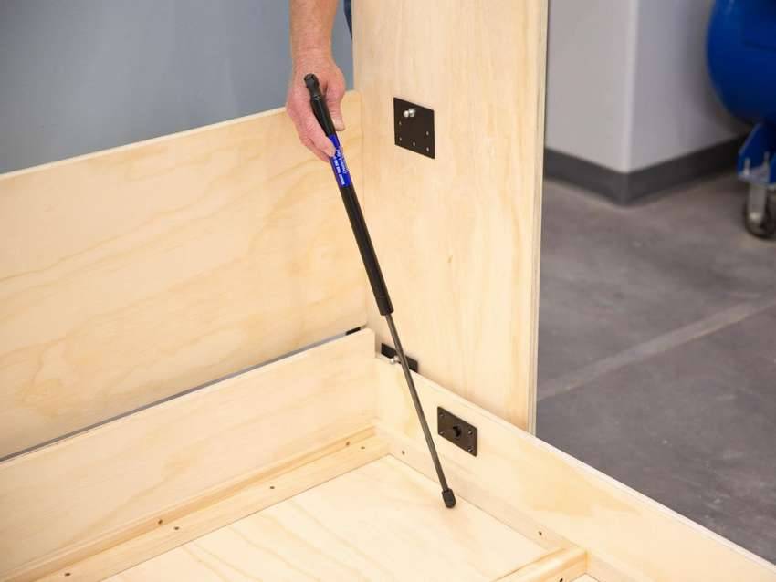 Чтобы короб, встроенный в каркас, без проблем опускался и поднимался, необходимо установить подъемный механизм. Для самостоятельного монтажа оптимально подходит обычное шарнирное устройство. С его помощью кровать опускается до горизонтального положения, а затем поднимается и скрывается внутри шкафа. Для облегчения процесса допускается использование противовеса, газлифтов, специальных пружин. Дополнительные механизмы обходятся дороже и требуют навыков при установке, но они обеспечат максимальную безопасность и легкость трансформации, если кровать изготавливается для ребенка.