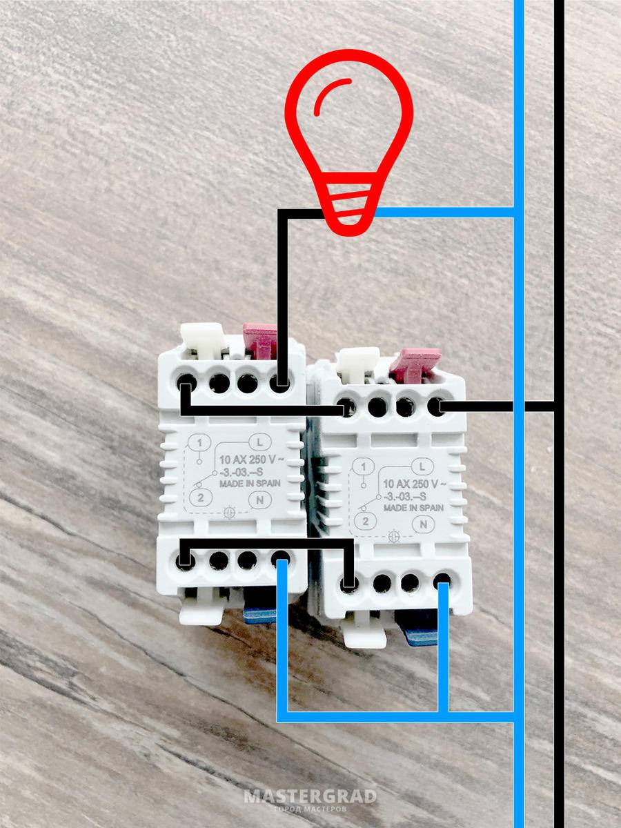 Схема подключения двухклавишных проходных выключателей
