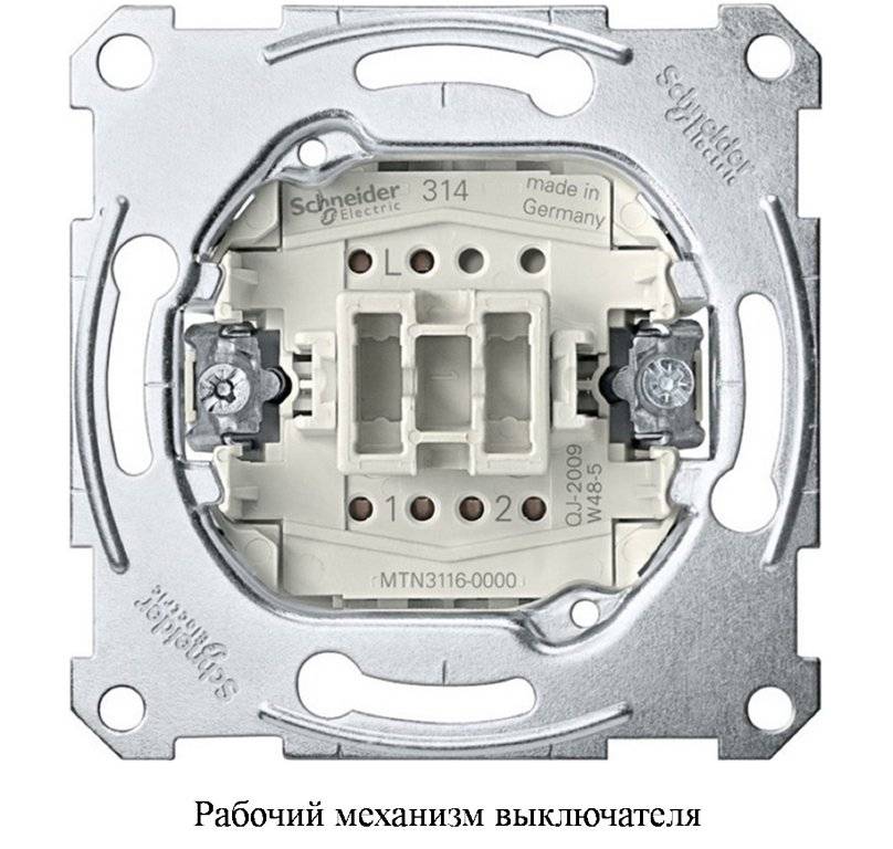 Рабочий механизм. Является основной частью устройства. Он включает в себя привод клавиши, установленный на металлической рамке. Для крепления всей конструкции в подрозетнике рамка имеет пару раздвижных лапок. Подключение электрических проводов осуществляется через специальные контакты. Установка рабочего механизма выполняется таким же образом, как и монтаж электрической розетки.