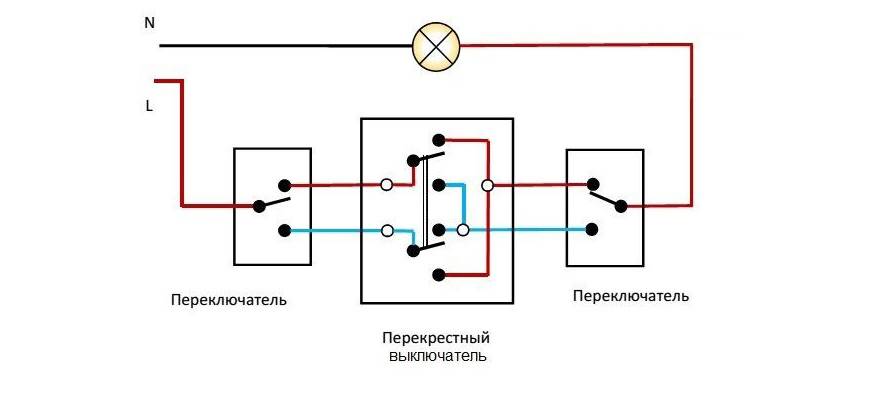 Для создания схемы используют проходные устройства в начале и конце электрической цепи. Между ними монтируют реверсивные переключатели. Общее число устройств равно количеству точек включения электричества.