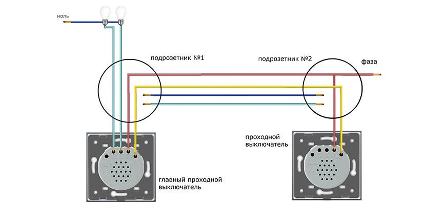 Здесь показано соединение двух сенсорных проходных выключателей.