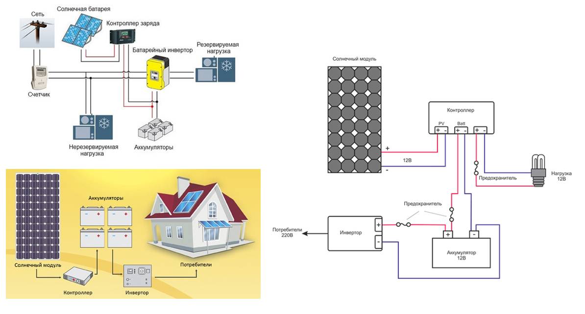 Помимо солнечного модуля в устройство такой электростанции входят фотоэлектрические преобразователи — контроллер и инвертор, а также подключенные к ним аккумуляторы