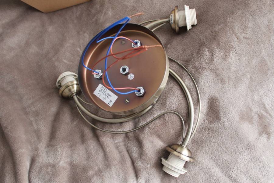 - Далее должно быть устройство (можно назвать его соединительной коробкой люстры), в котором будет производиться расключение проводов, к нему крепятся три рожка, а сам этот механизм соединяется с крышкой кронштейна. Через это устройство протянут сдвоенный провод (фазная и нулевая жилы). Один его конец будет соединяться с фазной и нулевой жилами, которые выходят из дырки в потолке, второй конец предназначен для соединения с жилами в рожках.