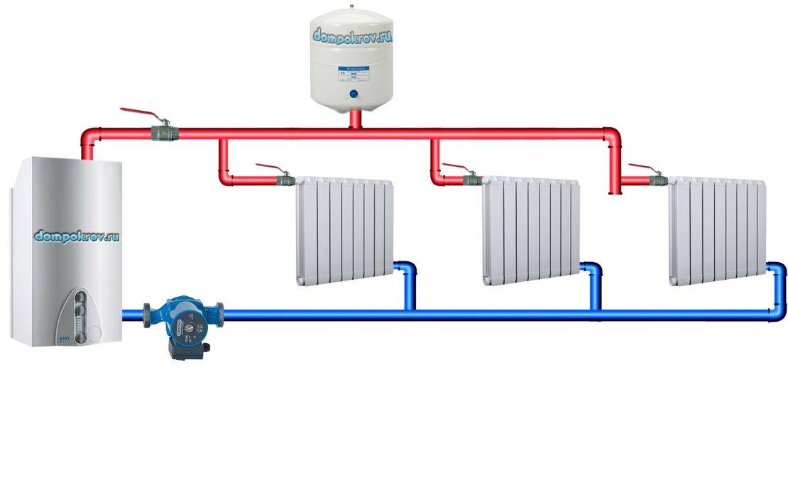 Схема действительно очень простая и понятная, поэтому с ее реализацией сможет справиться даже новичок. Она предусматривает последовательное соединение всех устанавливаемых радиаторов. Это идеальная схема разводки отопления для частного дома небольших размеров. Например, если это однокомнатный или двухкомнатный дом, то «городить» более сложную двухтрубную систему не имеет особого смысла.