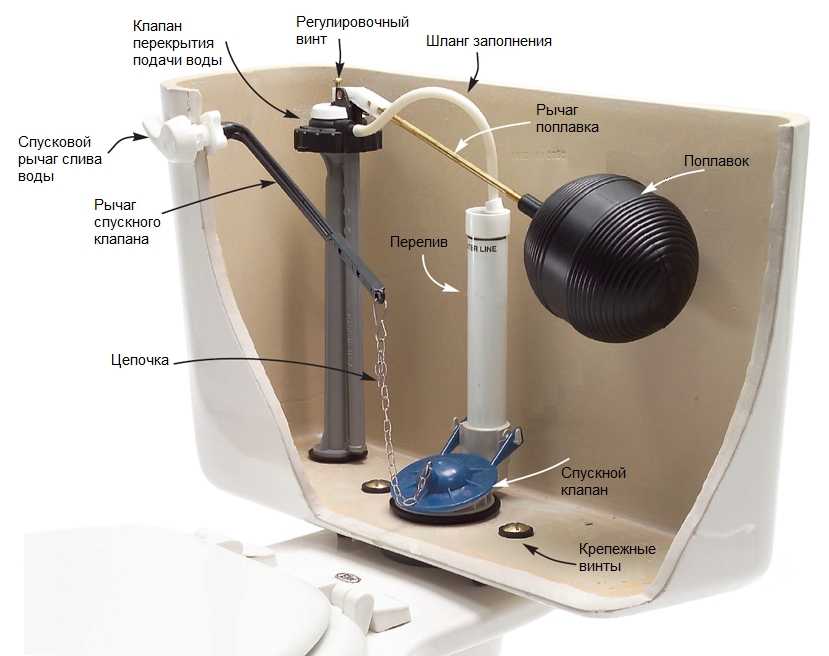 Различные модели бачка унитаза по конструкции могут сильно отличаться один от другого, однако набор их составляющих в целом остается неизменным. В каждом сливном баке обязательно имеются следующие компоненты: