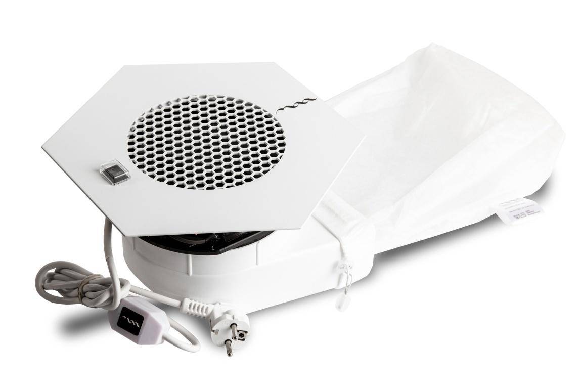 Маникюрная вытяжка «Торнадо» – еще один вариант российского производства. По уверениям самого изготовителя, аппарат очищает воздух на 90–95%. К преимуществам следует отнести съемные угольный и пылевой фильтры, а также наличие яркой светодиодной лампы в вытяжной трубе, которая значительно упрощает процесс работы, а также устраняет необходимость в дополнительном освещении. Мощность оборудования – 200 Вт, вентилятор совершает 2600 оборотов в минуту.