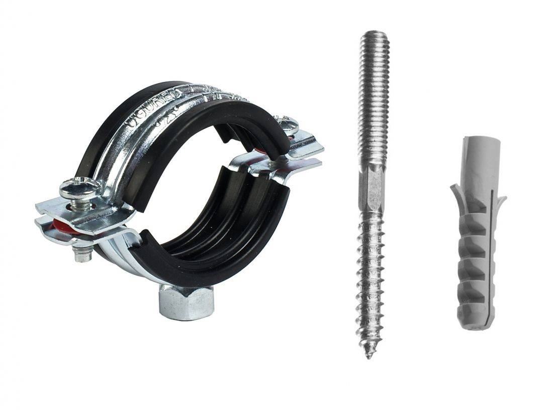Тип конструкции уже относят к неподвижным креплениям. Хомут представляет собой металлическое или пластмассовое полукольцо с резиновой прокладкой. Она присутствует не у всех моделей, но свой выбор лучше останавливать на таких крепежах: они обладают более высокой надёжностью, шумо и виброизоляционными способностями. Также у всех хомутов присутствует винтовое крепление. Что, соответственно, делает его монтаж и демонтаж более сложной процедурой, чем крепление полипропиленовых опор.