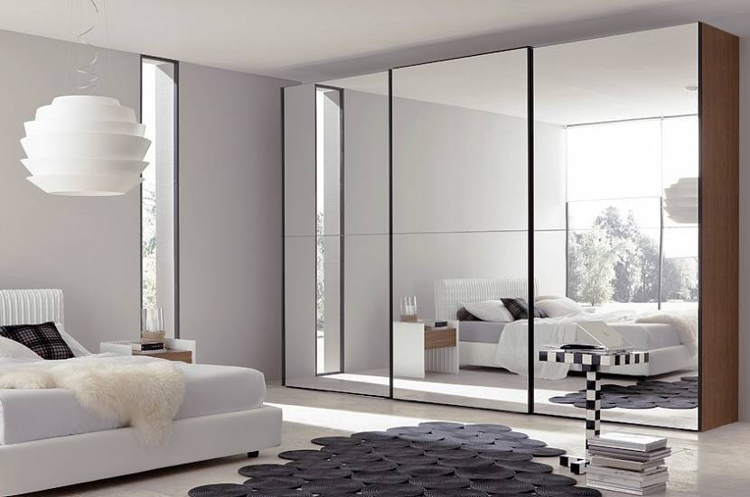 Актуально смотрится шкаф-купе с зеркальными дверцами, за которыми не видно разнообразие спрятанных вещей: обувь, сумки, одежда, бытовые элементы.